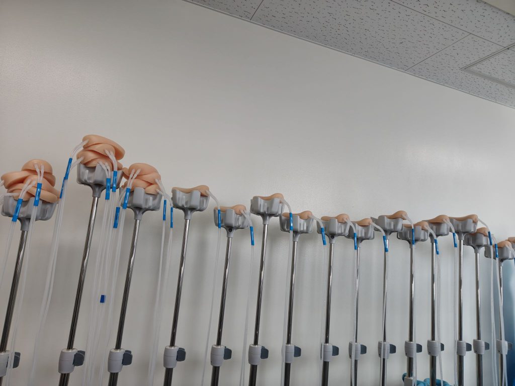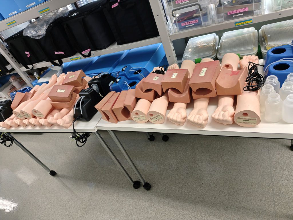 採血シミュレーター片付け Posted on 2026年2月18日 by 岡山大学大学院医歯薬学総合研究科附属医療教育センター 昨年から長期にわたり活躍していた採血シミュレーターの使用が一旦落ち着きました。数台を残し、洗浄し乾燥中です。水漏れのするパットも有効活用のため一緒に乾燥中です。入試が終わったら、腕にパウダーをして、ケースに収納の予定です。